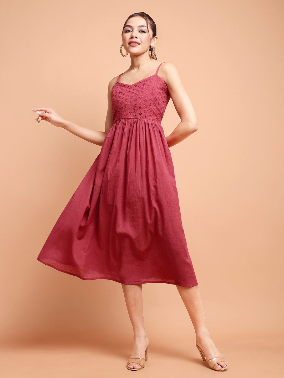 This elegant strap dress for women is ornamented with intricate schiffli lace embroidery which adds to its classy sophistication. This maroon-coloured knee length cotton dress should be a working woman’s go to choose in summer for comfort and style. Make a definitive style statement with classic creation in your wardrobe which is perfect for any casual or semi-formal occasion. The ultra-light and breathable cotton fabric will keep you cool and comfortable outdoors during summer season.