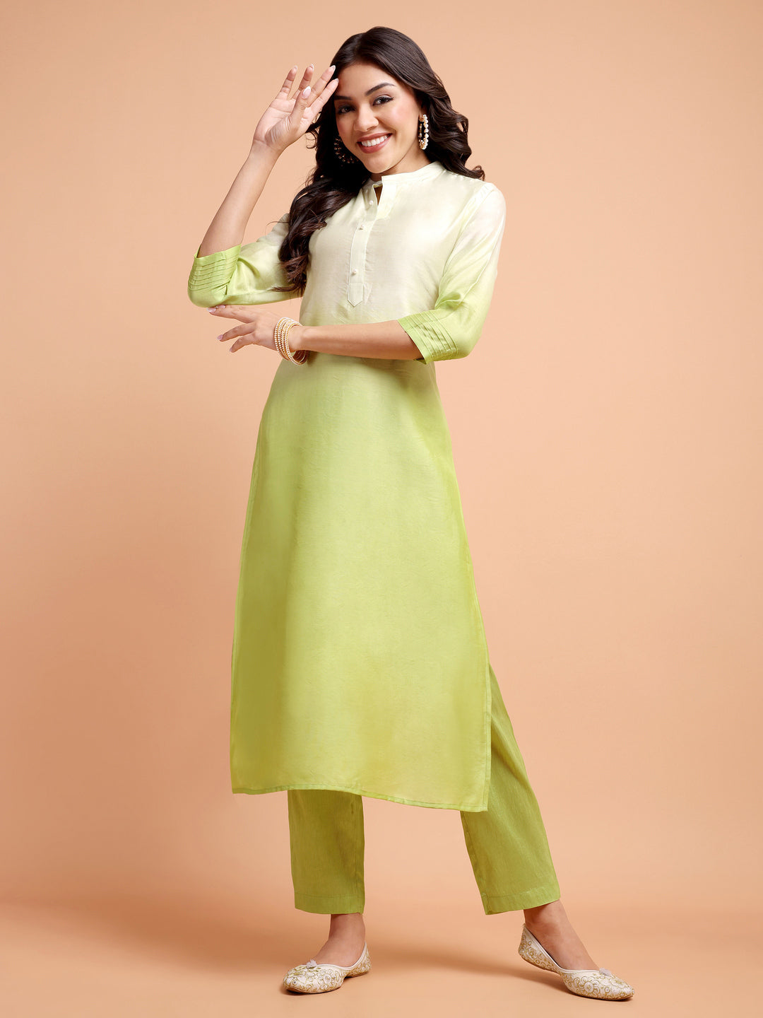 This classy shaded green ethnic kurta set for women consists of an ombre dyed Chanderi Kurta and a crisp Dupion Silk Bottom. The luxurious ombre finish, the jewel neckline and the pearl buttons on the front placket enhance the glam quotient of this ethnic wear kurta set. Perfect for chic casual as well as festive settings this ethnic wear kurta set will add an elegant touch your wardrobe. The lightweight and gossamer Chanderi fabric keeps you cool during the hot summer months.